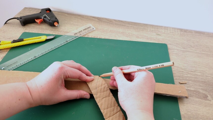 Pásek otočte zadní stranou dolů a po celé délce ho postupně ohýbejte směrem dovnitř. Karton se díky tomu stane ohebným a půjde snadno tvarovat kolem rukojeti.