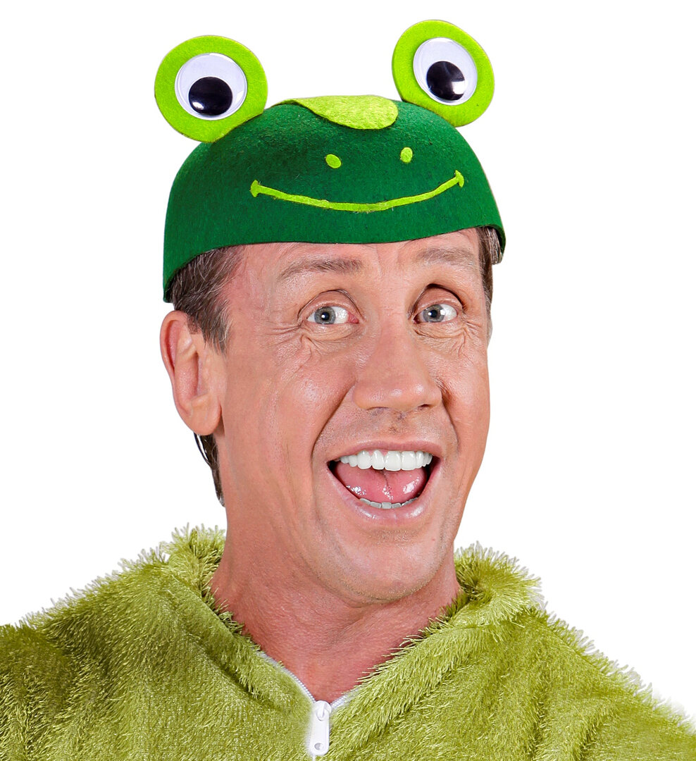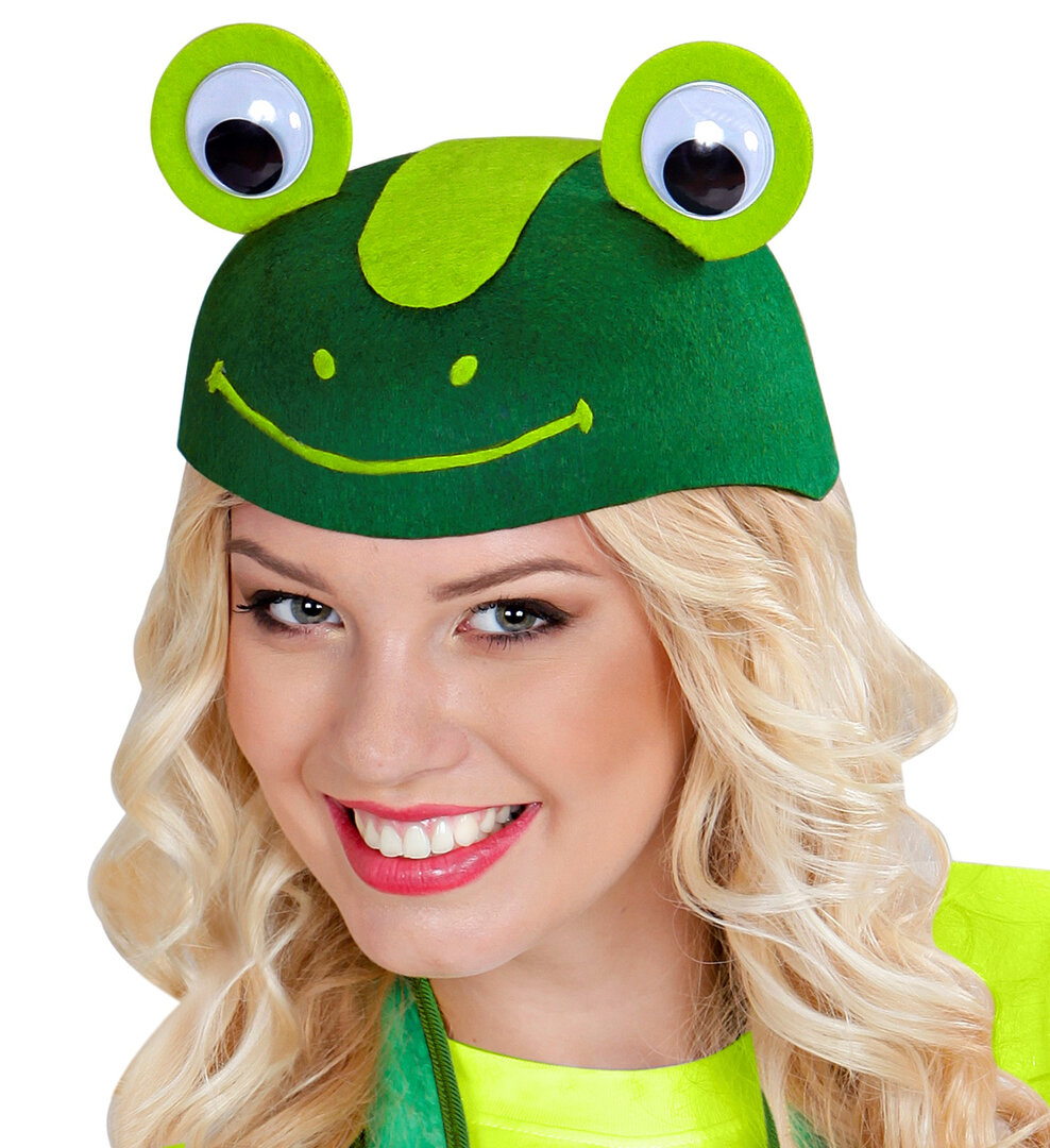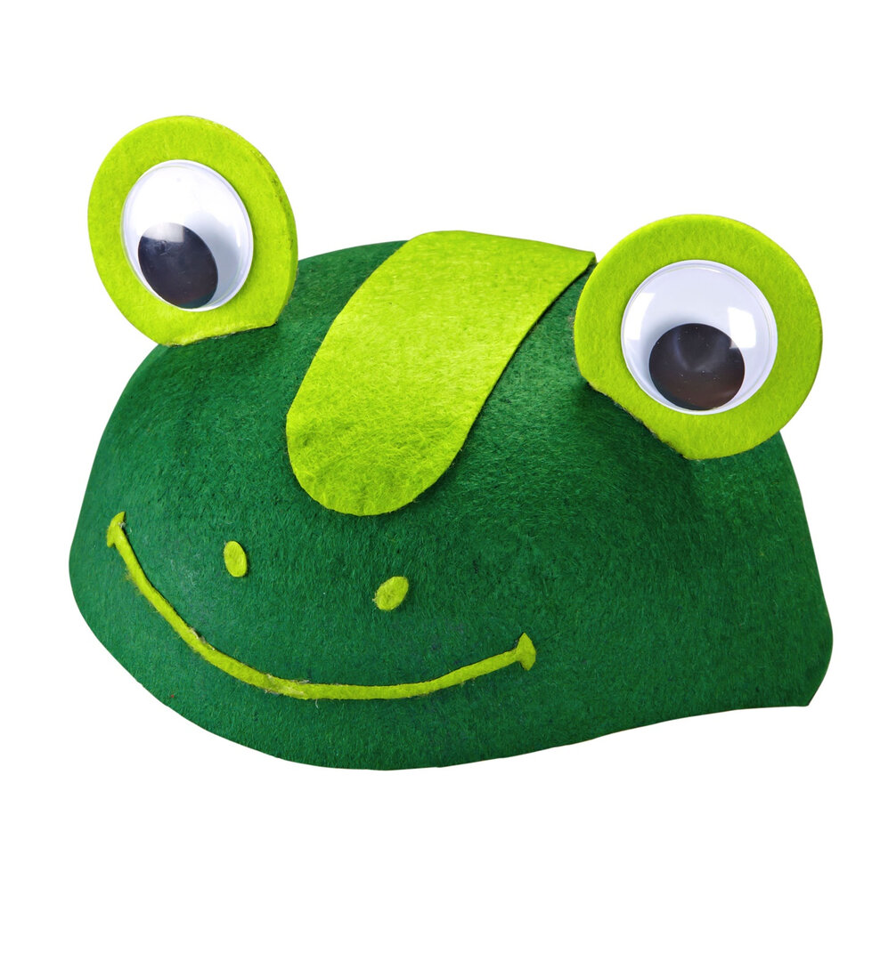 Zelená plstěná čepice typická pro veselou žabku. V horní části jsou umístěny oči žáby.
