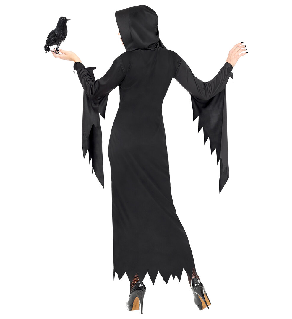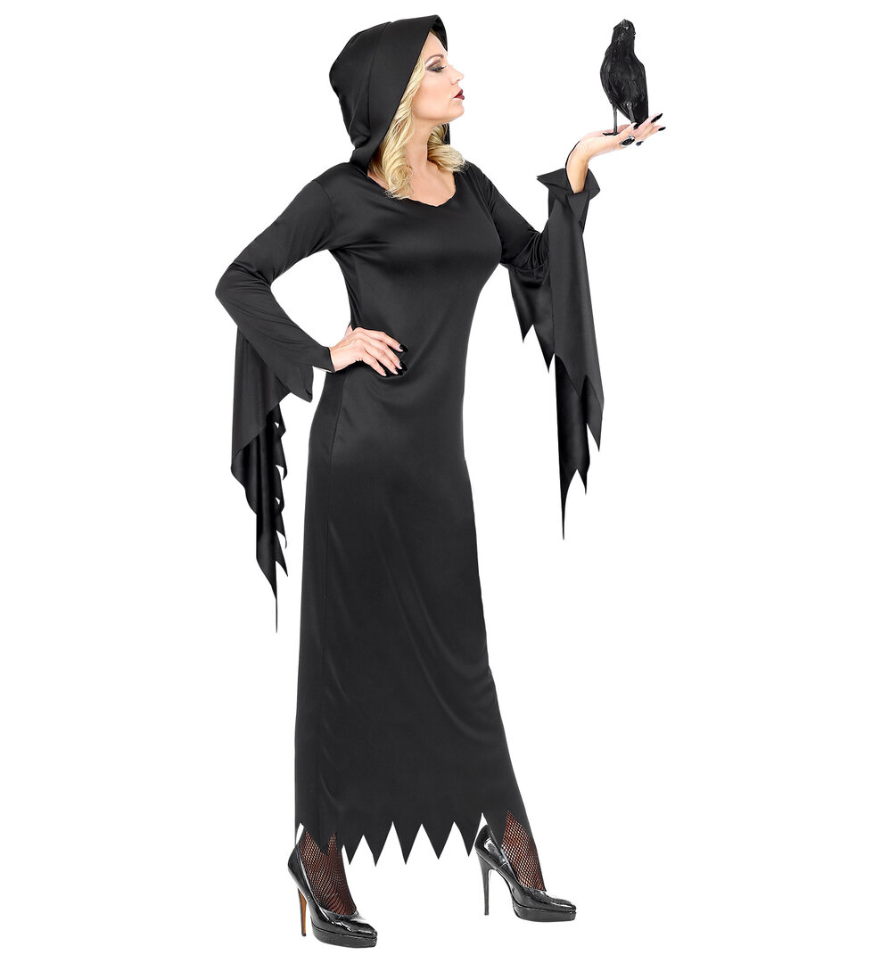 Univerzální černé šaty s kapucí je možné využít jako kostým čarodějnice, vampírky, temné kněžky nebo třeba Morticii Addams. V každém případě se vám budou hodit na halloweenskou akci či hororovou party.