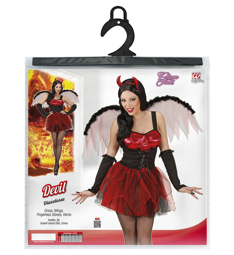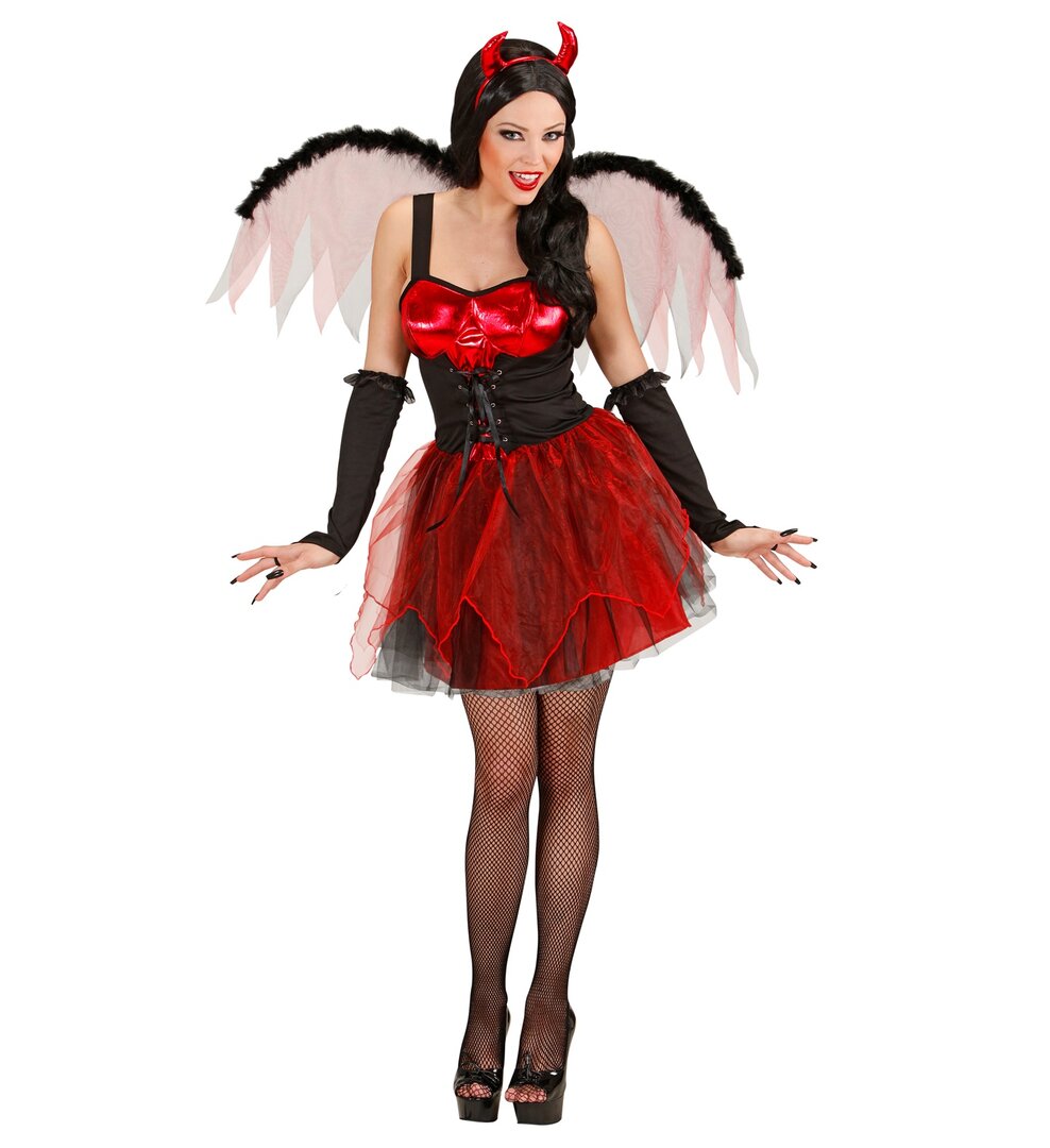 S těmito sexy šaty se o Halloweenské noci proměníte v temnou ďáblici, kterou zaručeně nikdo nepřehlédne. Kostým se skládá z černočervených šatů, křídel, rukavic a čertovské čelenky. Doporučujeme dokoupit paruku, černé punčocháče a vidle do ruky z naší nabídky.