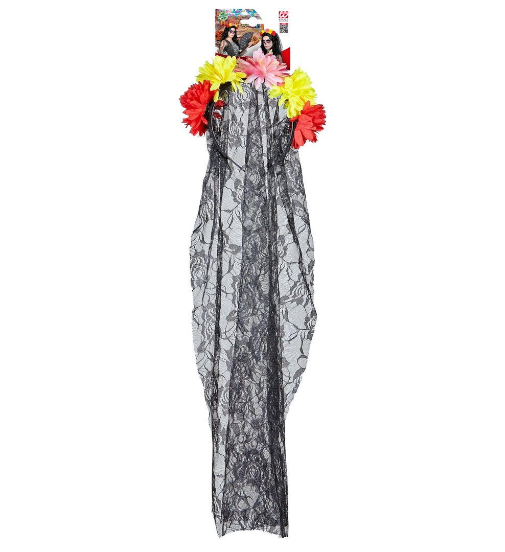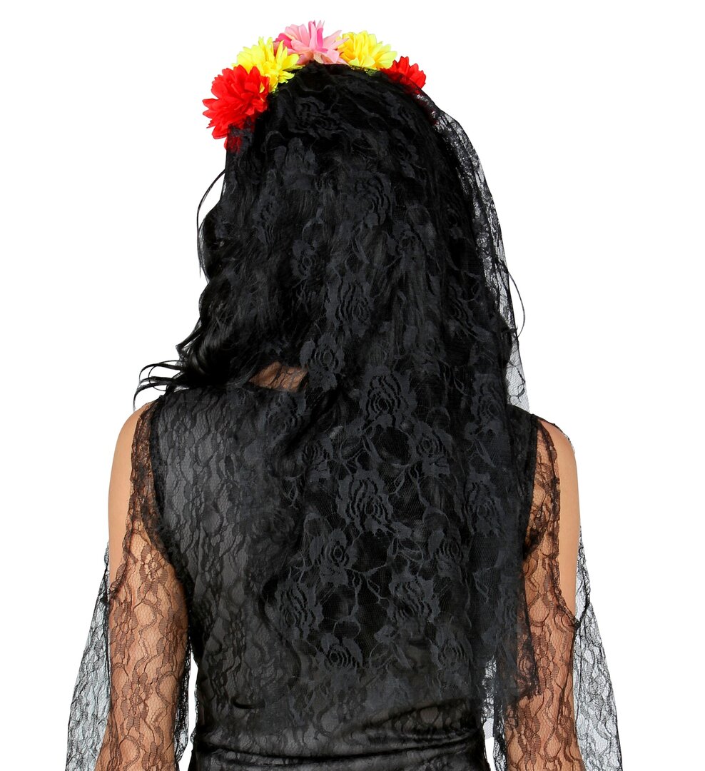 Vyrážíte na party ve stylu Dne mrtvých? Co se připravit do posledního detailu a doladit outfit touto čelenkou, jež je tvořená barevnými květinami s černým závojem?
