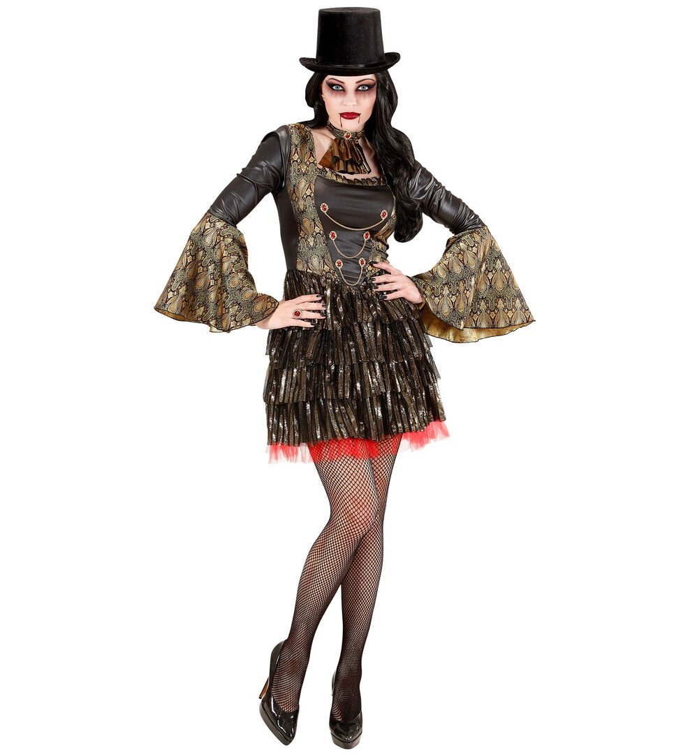 Temná krása s gotickým šarmem! Tento dámský kostým Gotická upírka zahrnuje výrazné šaty v gotickém stylu a ozdobný límec u krku, který podtrhuje tajemný a elegantní vzhled. Ideální volba na Halloween, strašidelnou párty nebo večírek s temnou atmosférou. Pro ženy, které se nebojí vyniknout a milují styl s nádechem nadpřirozena.