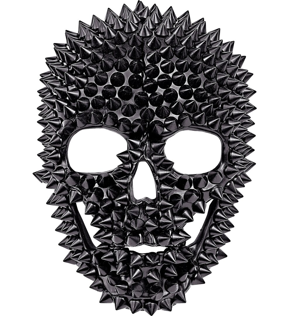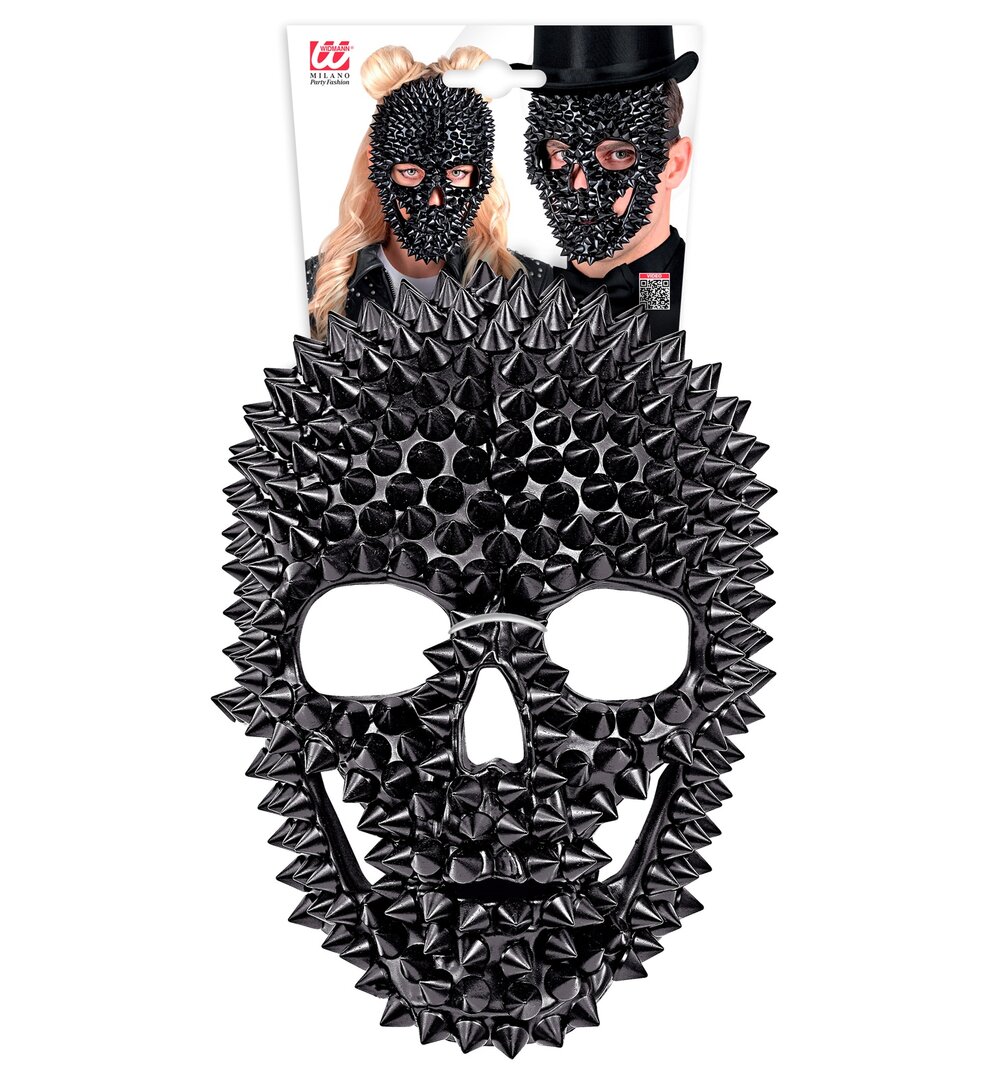Černá maska s motivem lebky ozdobená ostny, která dodá vašemu vzhledu drsný a výrazný styl. Ideální doplněk na Halloween, festivaly, cosplay nebo alternativní akce.