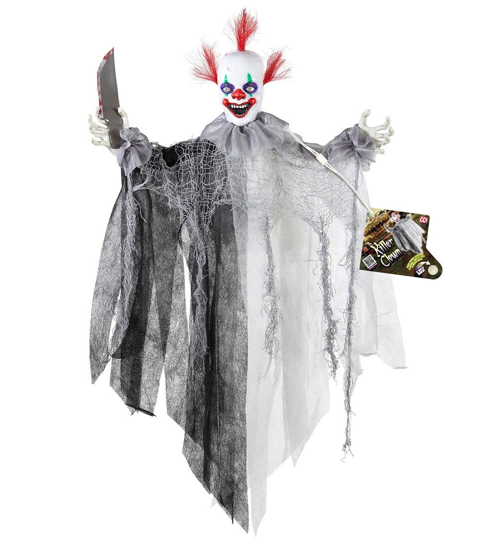 Dekorace vražedného klauna s nožem, svítícíma očima a s cirkusovou hudbou.
