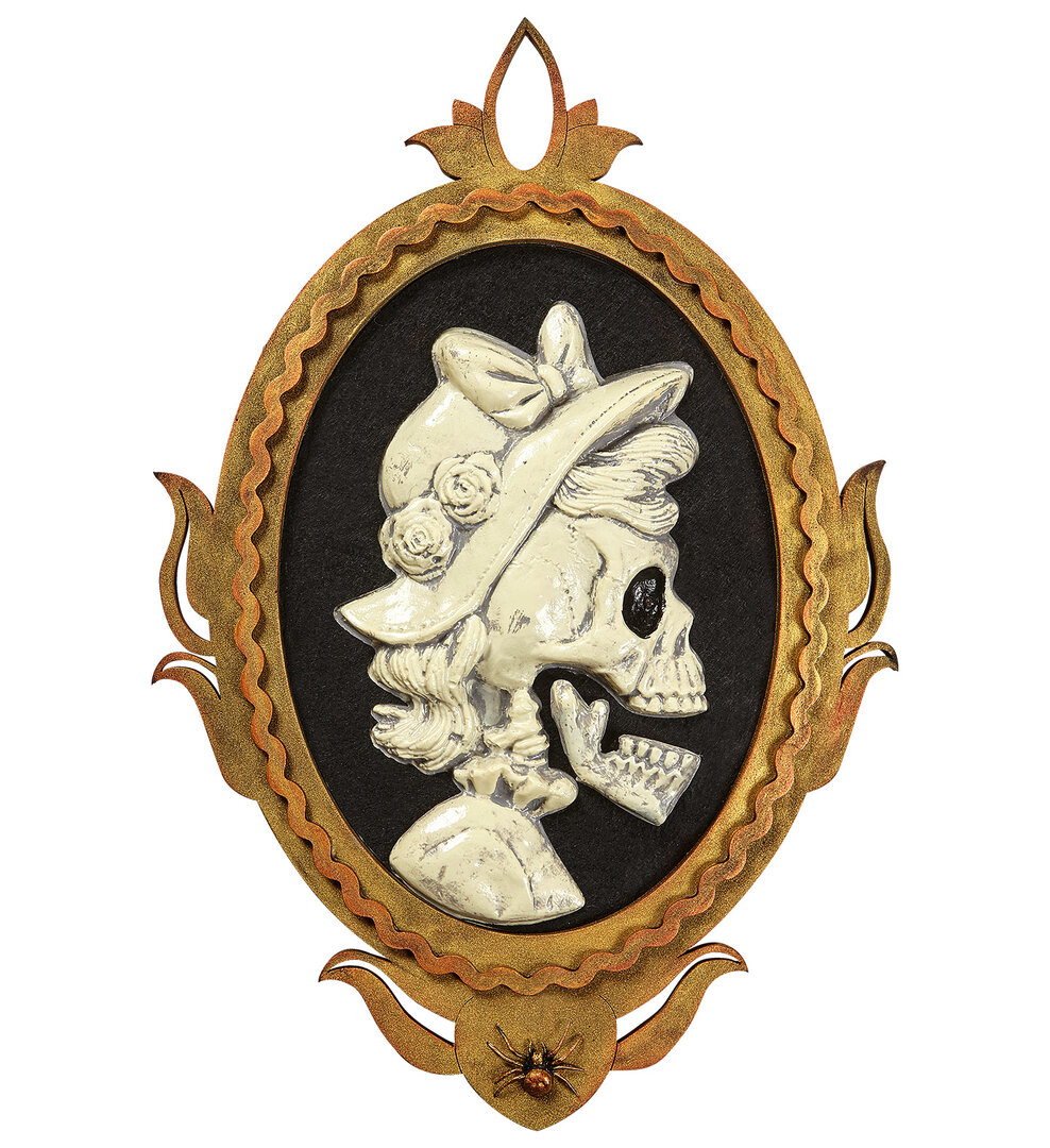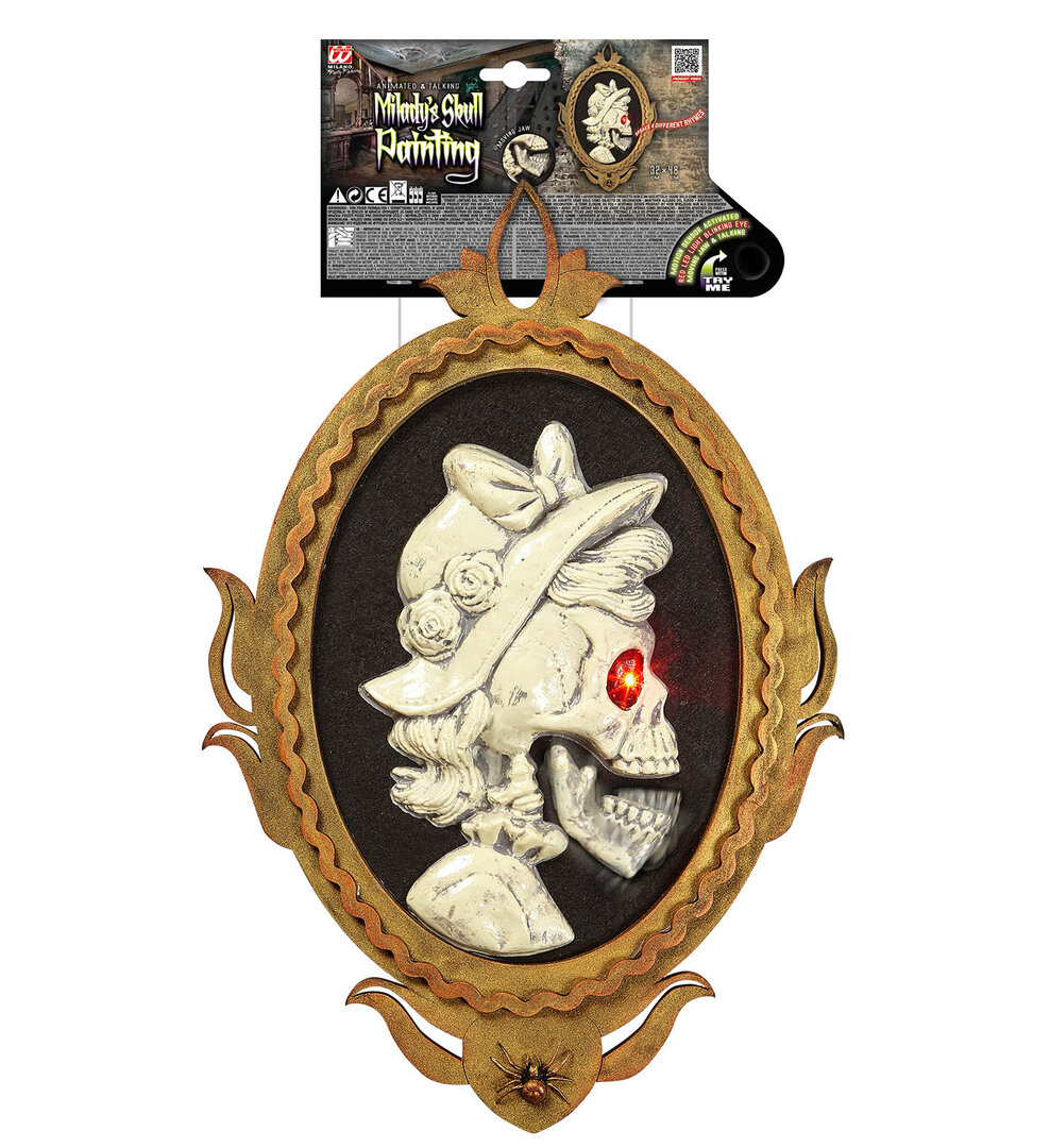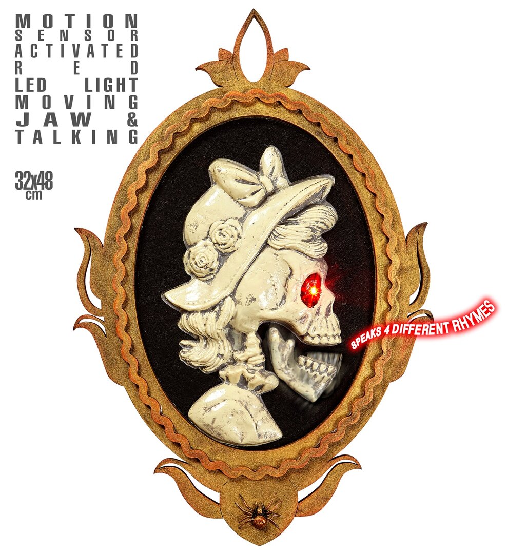 Perfektní dekorace na Halloween, která dodá Vaší výzdobě tu pravou atmosféru.Lebka v obrazu má  LED svítící červené oko a pohyblivou čelist. Vydává 4 různé zvuky. Rozměr 32 x 48 cm.