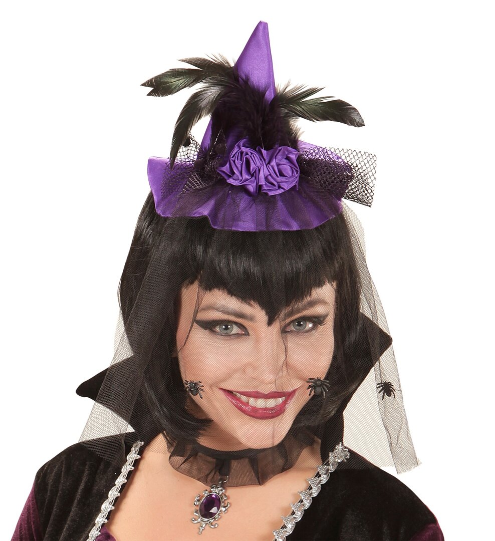 Čarodějnický mini klobouček s pavouky, fialový Čarodějnický mini klobouček s pavouky, fialový