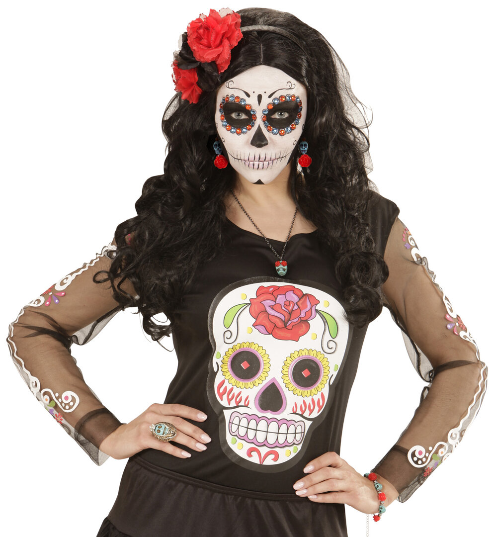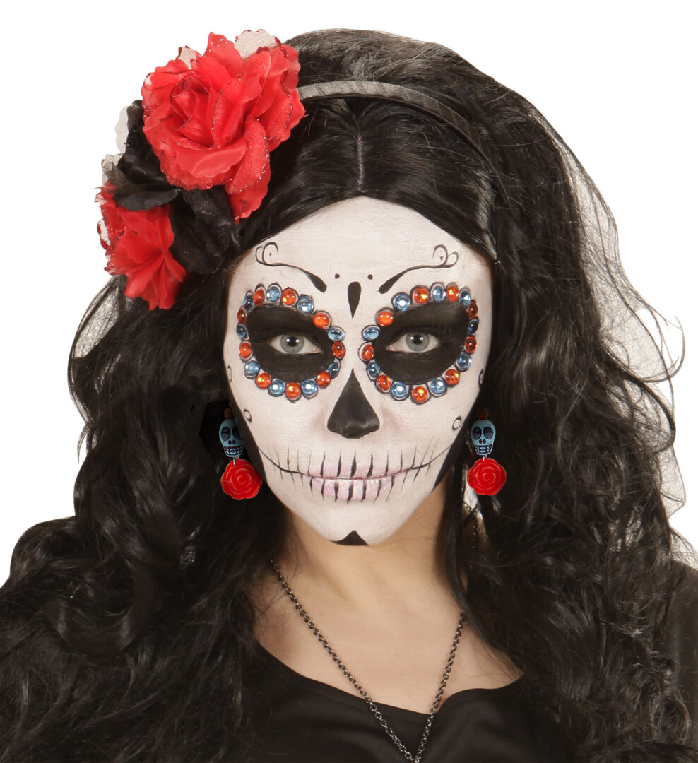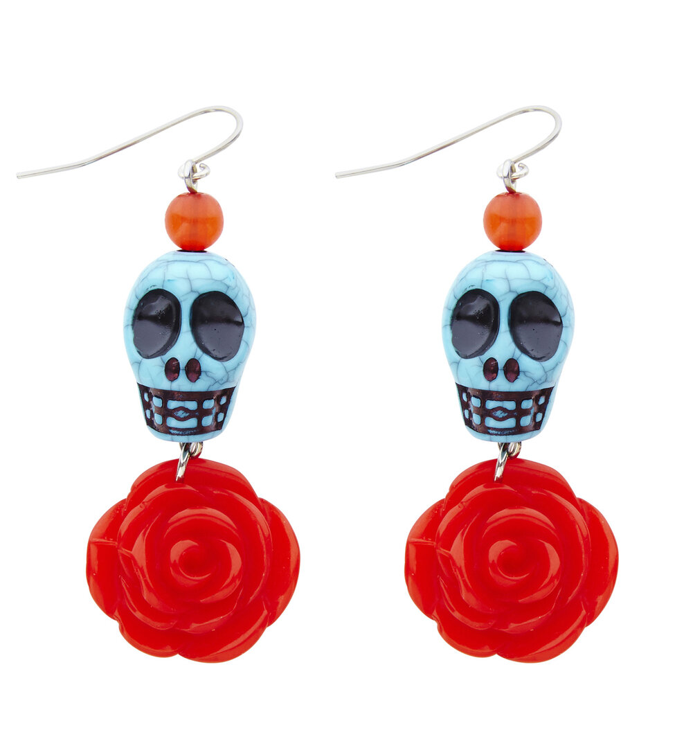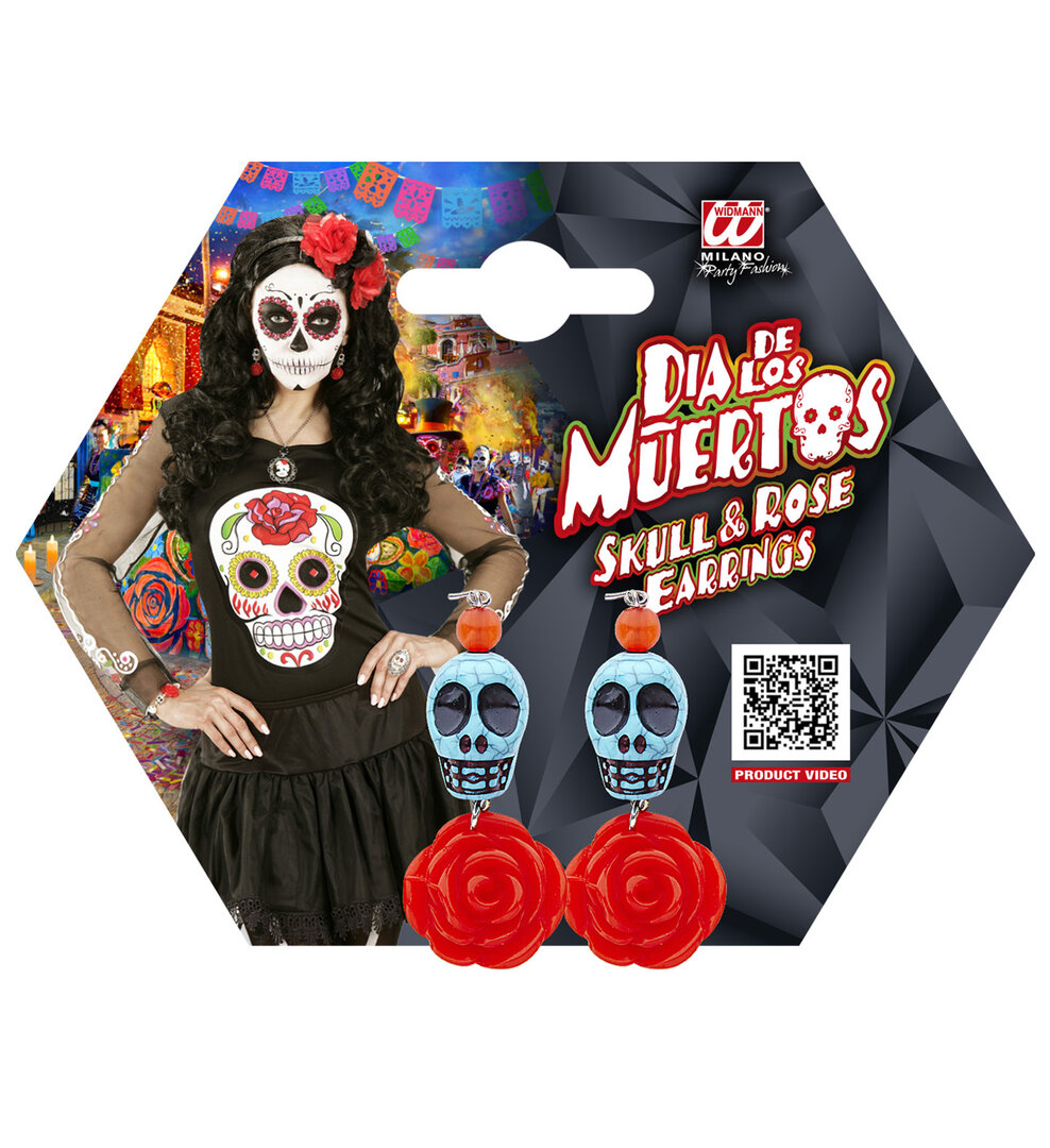 Výrazné náušnice s jedinečnou kombinací azurových lebek a sytě červených růží přitáhnou pozornost na první pohled. Ideální doplněk pro milovníky alternativního, rockového nebo gothic stylu.