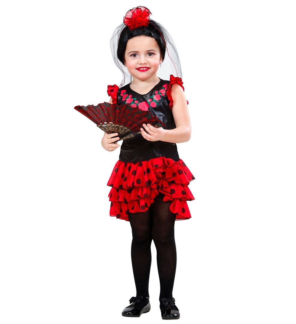 Dětský kostým Señorita obsahuje krásné šaty a květinovou čelenku se závojem. Skvělý doplněk pro karneval, Halloween nebo tematické párty.