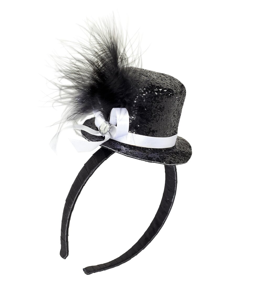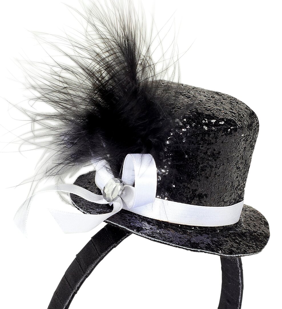 Mini klobouček s pírkem a drahokamem, černý Mini klobouček s pírkem a drahokamem, černý
