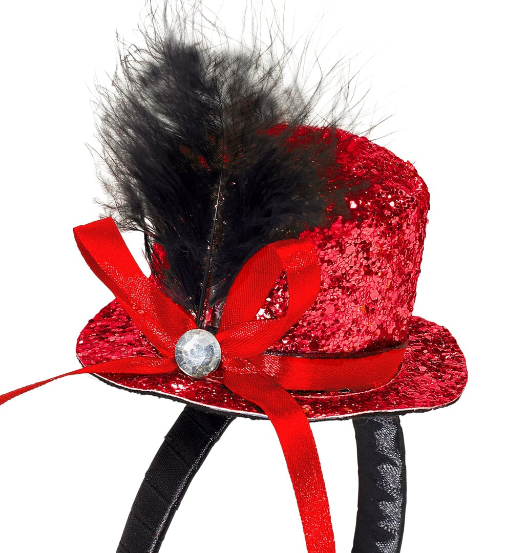Mini klobouček s pírkem a drahokamem, červený Mini klobouček s pírkem a drahokamem, červený