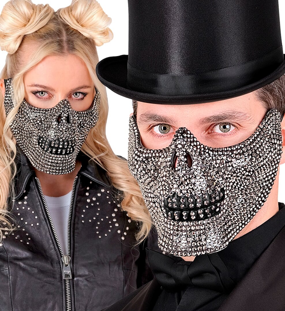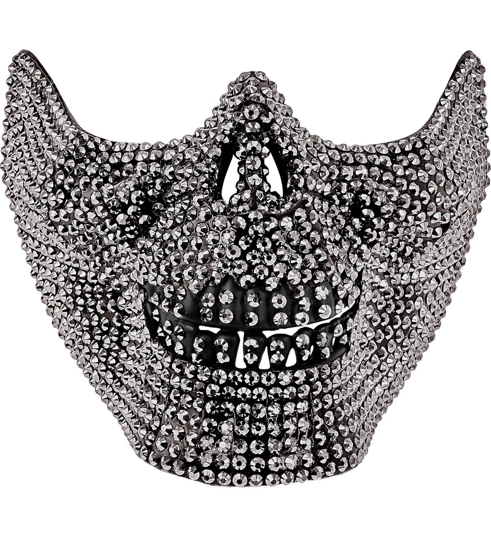 Stylová obličejová maska s výrazným motivem lebky, doplněná o třpytivé kamínky pro originální a nápaditý vzhled.