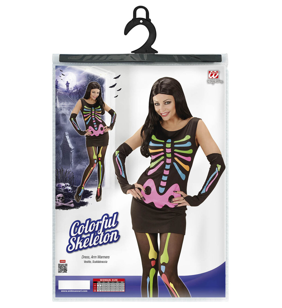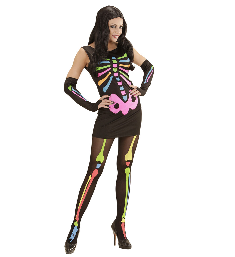 Stylový a svítivý kostým Neonová kostra rozzáří každý karneval nebo halloweenskou párty! Obsahuje šaty s barevným kosterním potiskem a ladící návleky na ruce. Ideální pro všechny, kdo chtějí spojit trochu strašidelna s pořádnou dávkou barevné zábavy.