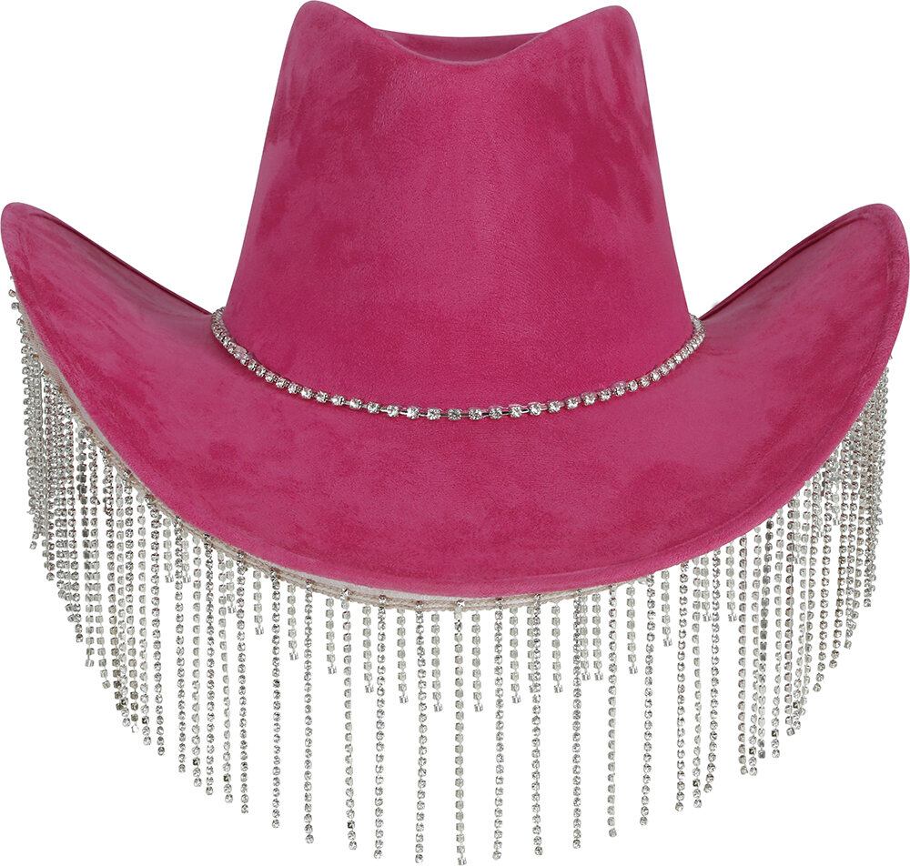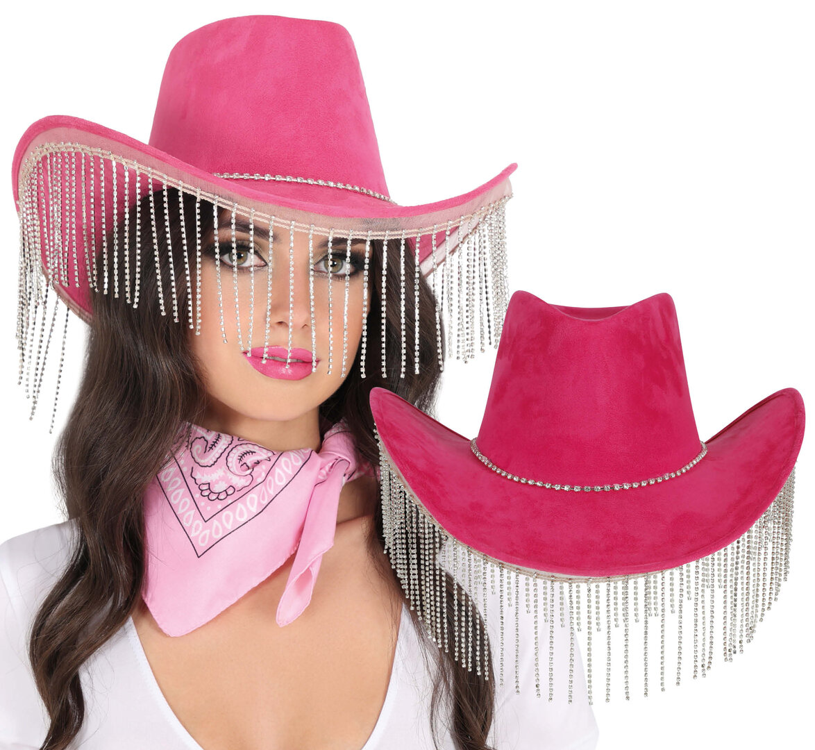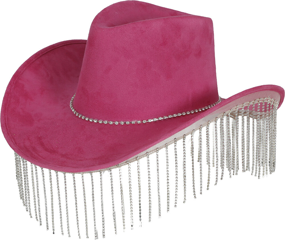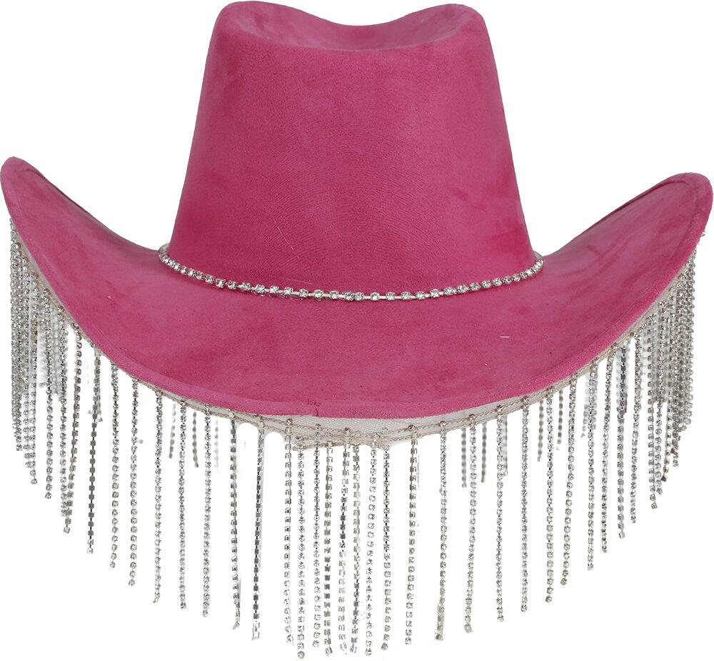 Růžový dámský kovbojský klobouk s perličkovými třásněmi Růžový dámský kovbojský klobouk s perličkovými třásněmi