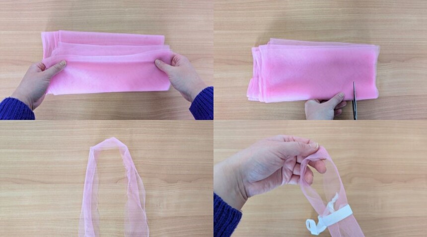• Tyl několikrát přeložte, aby se vám lépe stříhal, a na přeloženém konci nastříhejte pruhy široké přibližně 5 cm. Jakmile máte všechny pruhy připravené, rozložte je a vždy vezměte dva dohromady. Pruhy přehněte v polovině, horní přeloženou část položte pod gumu nebo stuhu a povytáhněte, až vznikne očko. Spodní částí je provlékněte vzniklým prostorem. Vytvoří se tak uzlík jako na kravatě.