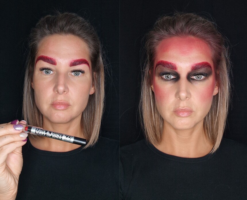 Červený make-up aplikujte jako tvářenku a roztírejte směrem od lícních kostí ke spánkům a čelu až po vlasovou linii. Stejnou barvu naneste i pod čelistí a roztírejte ji směrem dolů přes krk. Pro plastický efekt přidejte trochu černého make-upu a prsty ho lehce vklepejte do červené barvy. Vznikne tak elegantní, ale přesto pekelně výrazné stínování.