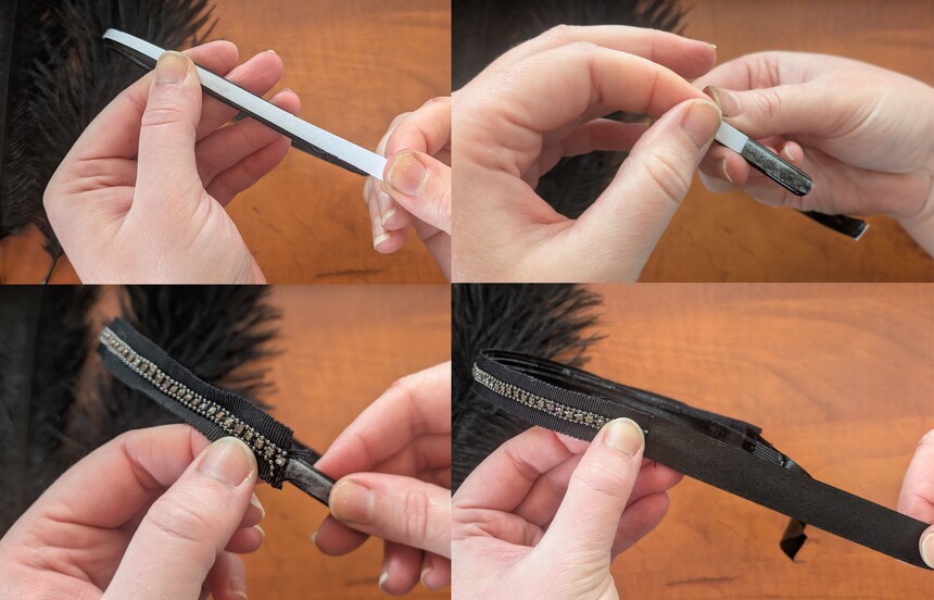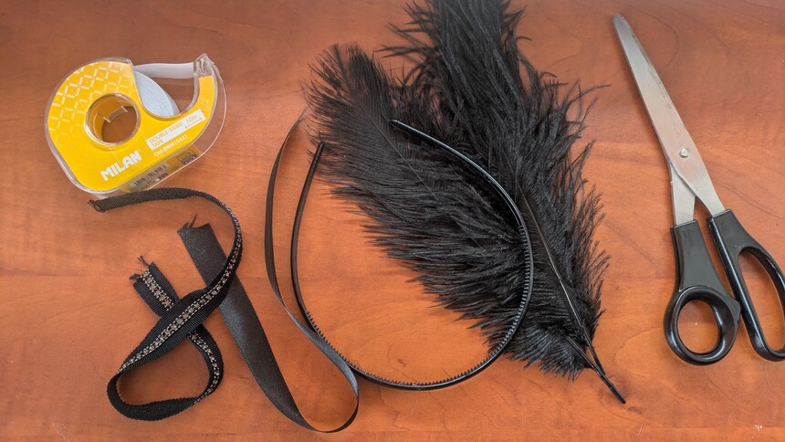 Nejprve si připravte samotnou čelenku. Po celé její délce nalepte oboustrannou pásku a sloupněte ochrannou vrstvu. Poté na pásku připevněte ozdobnou stuhu. Pokud ji nemáte, můžete použít i obyčejnou černou nebo bílou stužku a tu následně doplnit nalepovacími kamínky nebo celým řetězem kamínků. Barvu volte podle toho, do jakého tónu chcete ladit celý kostým.¨