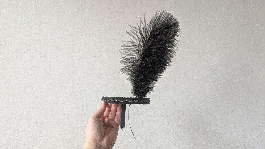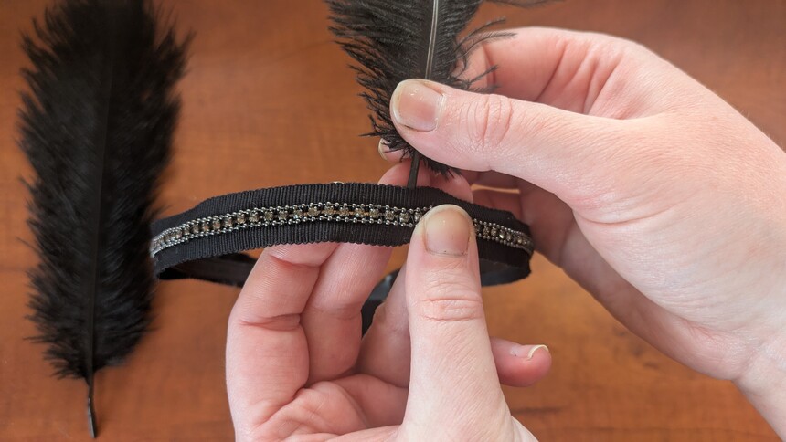 Dalším krokem jsou pírka. Na jejich spodní část připevněte oboustrannou pásku a nalepte je na přední stranu čelenky, ideálně lehce na bok, ne přímo doprostřed. Pírka by měla směřovat vzhůru a čelenku doplnit, ne ji celou zakrýt. Právě boční umístění je pro styl dvacátých let typické a působí přirozeně i vyváženě.