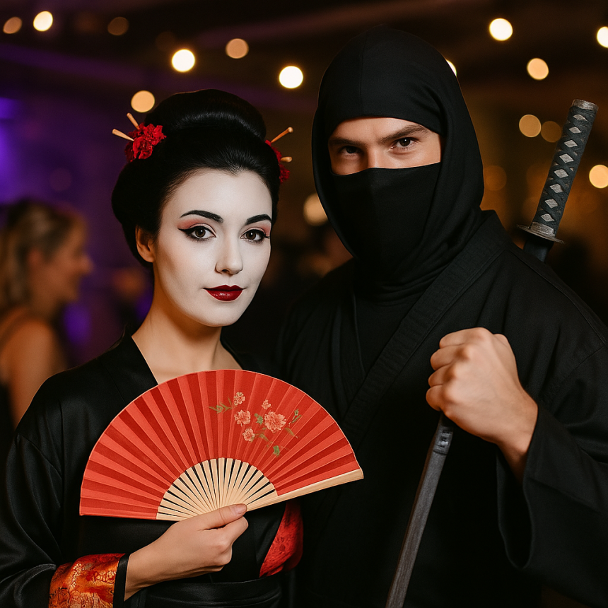 Ninja a gejša - kontrast bojovníka a elegantní společnice. Ninja se pozná podle černého převleku a katany, gejša potřebuje kimono, bílý make-up, rudou rtěnku a paruku s vyčesaným účesem. Doplněk v podobě vějíře nebo slunečníku celý outfit doladí.