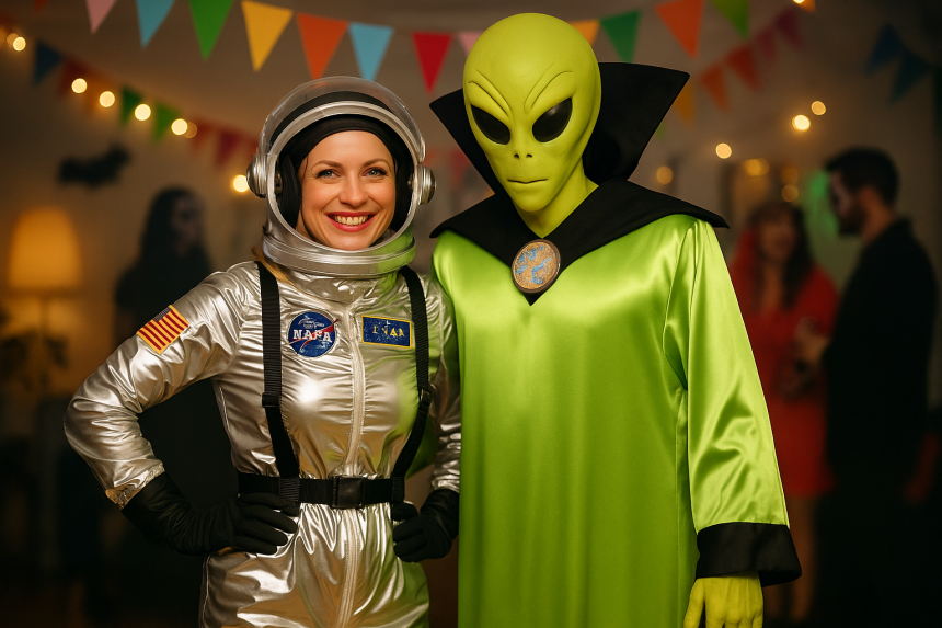 Kosmonaut a mimozemšťan - převlek inspirovaný vesmírem a setkáním člověka s bytostí z jiné planety. Kosmonautovi stačí bílý overal, helma nebo stříbrná kukla a rukavice. Kostým můžete doplnit nášivkami NASA. Mimozemšťan se dá pojmout různě - pomocí lesklé kombinézy, barevného make-upu, velkých brýlí nebo čelenky s anténkami. Skvěle vypadají i svítící doplňky, které dodají „mimozemský" efekt.