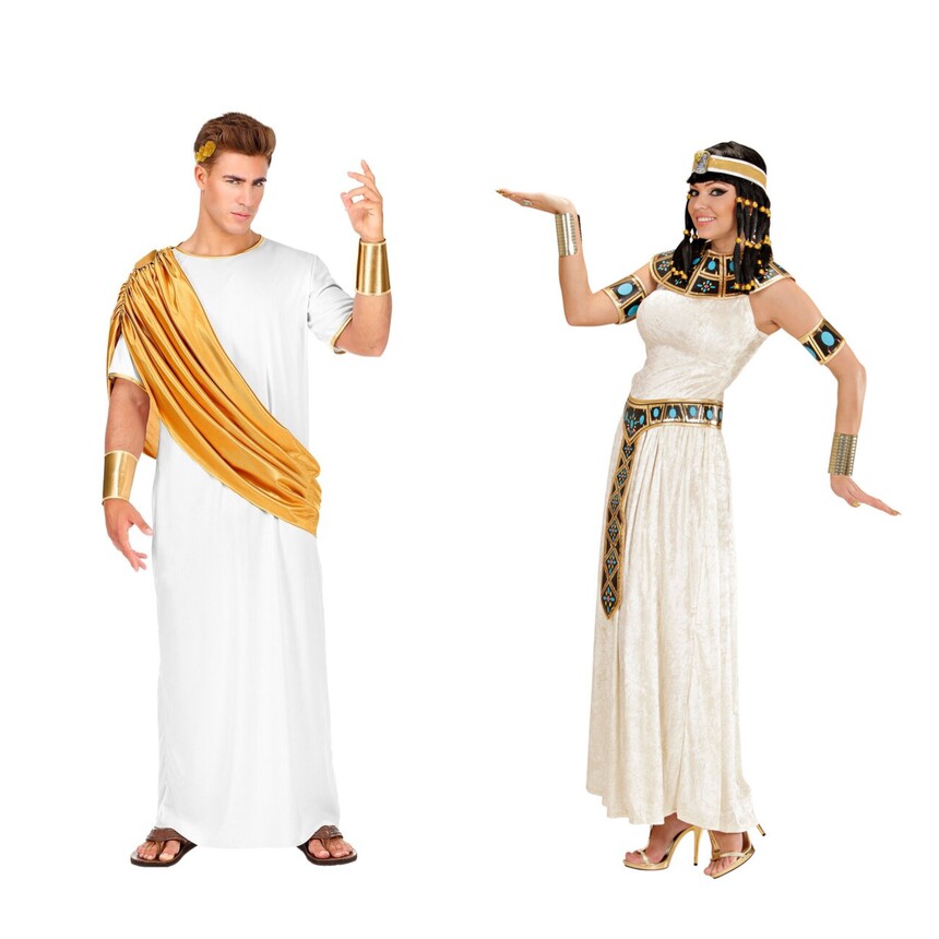 Jak na kostým: U Kleopatry je klíčový elegantní vzhled - bílé nebo zlatavé šaty, černá paruka s ofinou a výrazné líčení očí inspirované egyptským stylem. Nezbytností jsou zlaté doplňky: náramky, náhrdelníky a čelenka, většinou s motivem hada. Caesarovi postačí bílá tóga, kterou zvládnete vyrobit i z prostěradla, sandály a vavřínový věnec.